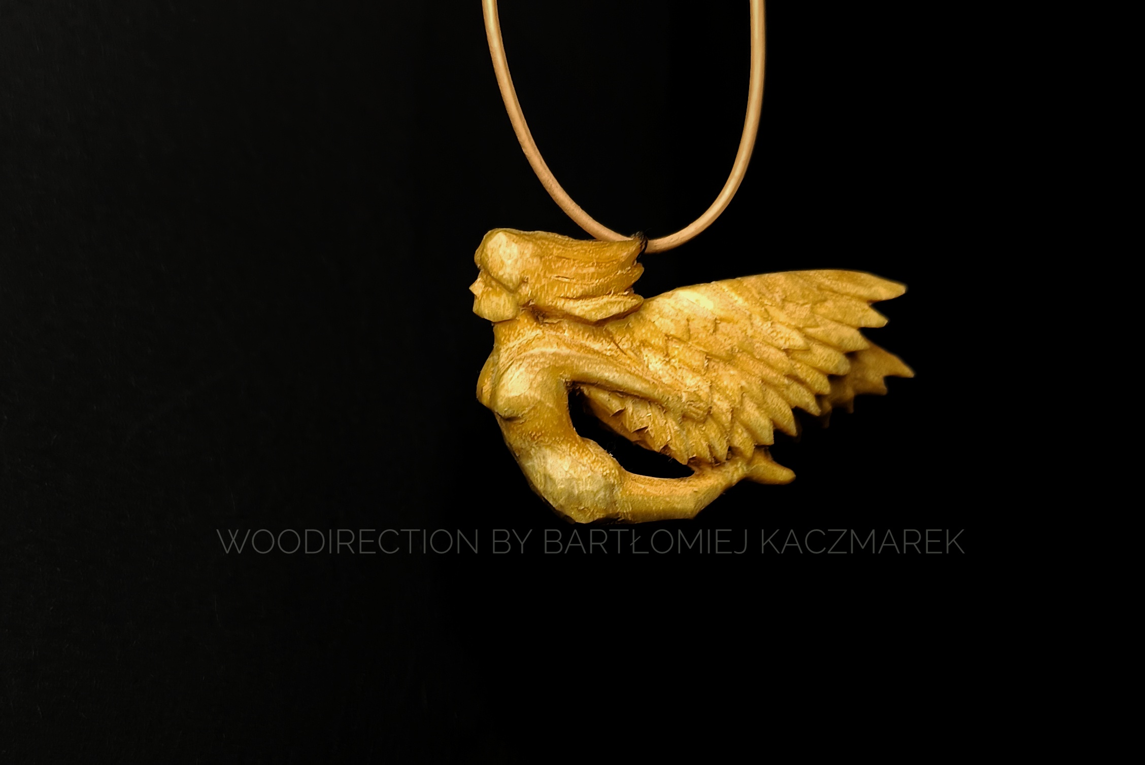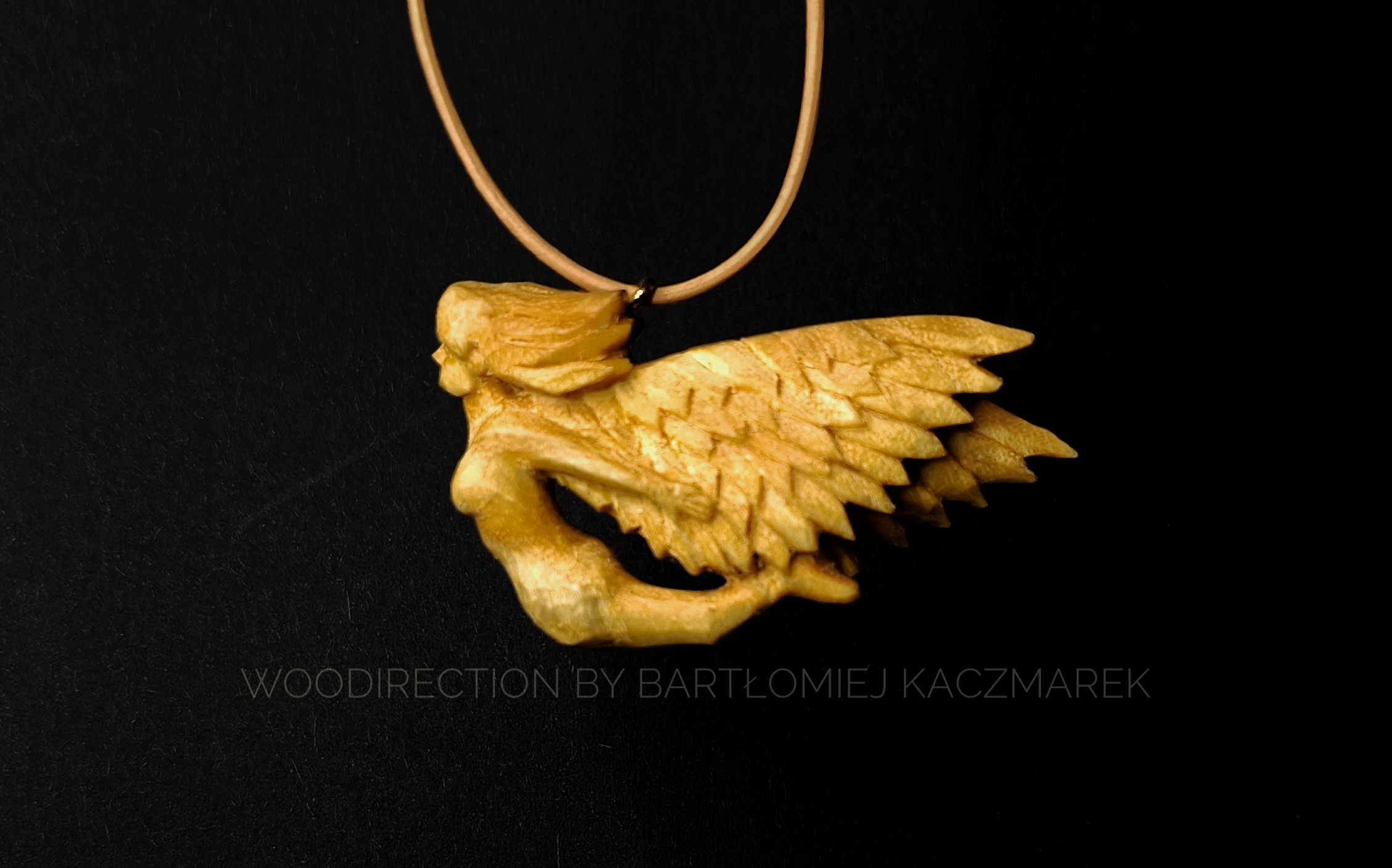 Ręcznie rzeźbiona zawieszka, której każdy detal i kształt, tworzyłem używając tylko najwyższej jakości drewna i moich ulubionych ręcznych narzędzi.